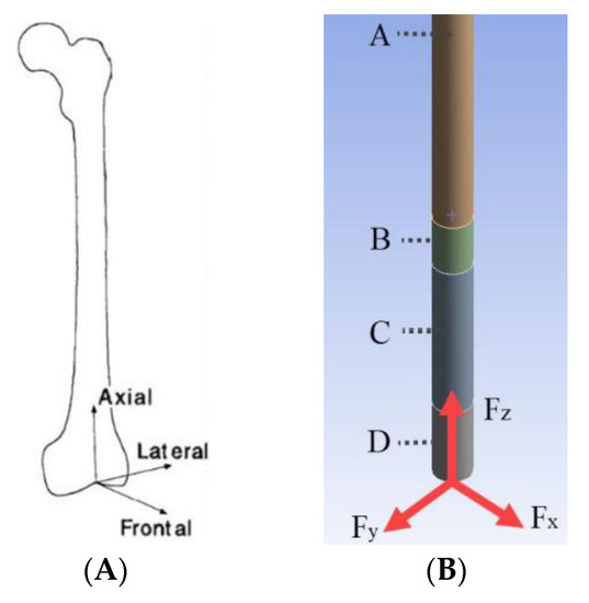 (A) Forces acting upon the femur along the bone’s structure [21], (B) FBD of the ITAP, built into Sections A, B, C and D.