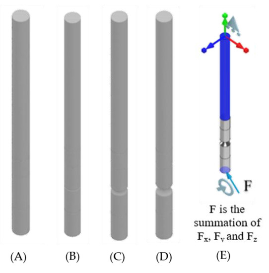 Fixed contact between the bone-anchor and ITAP, (A–D) Standard ITAP to 5 mm safety notch topology reduction models results, (E) FBD of the applied walking loads.