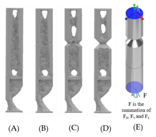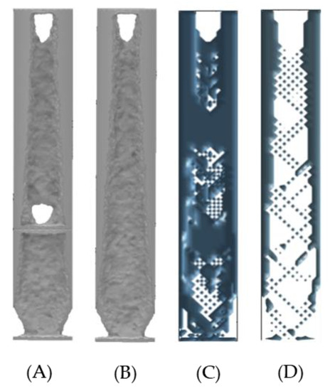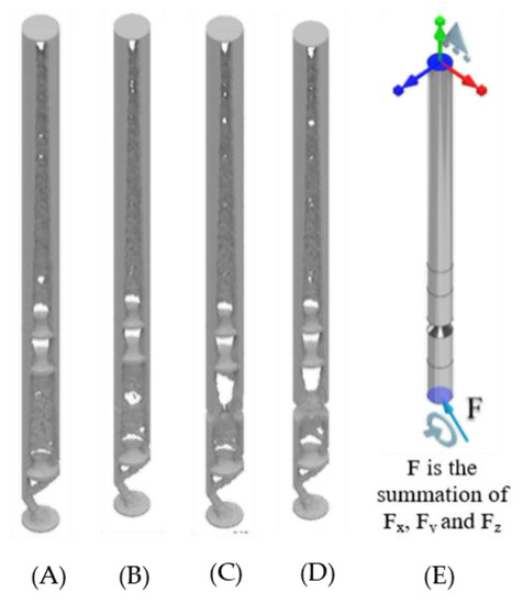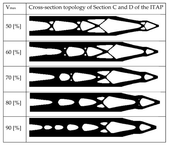 The resulting design structures (Figure 9) show that as the maximum volume of the model increases, the size of the voids forming in the ITAP decrease. This is most prominent in the voids forming at the boundary wall and the voids forming where sections C and D meet. This study has identified where the areas of the topology of the ITAP should be changed depending on the volume of the material used in additive manufactured production processes for complex internal structures. The topology simulation using MATLABs’ applied load only consisted of one shear force, rather than the three forces that are applied to the ITAP in motion. Furthermore, the force cannot be set to the applied loads identified in Section 2.1. As such, the results from this study can only be used as a guideline.