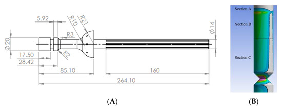 Figure 8. (A) Initial ITAP designed, (B) σ distribution in the 5 mm safety notched ITAP.