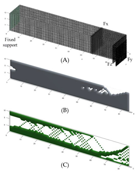 (A) FBD of the 3D MATLAB topology simulation utilising the external Sections, C and D, of the ITAP, dimensions of 85 mm by 14 mm by 14 mm with applied loads, (B) Vertical model using Fx and Fy 95% volume of material, (C) Vertical model using Fx and Fy 55% volume of material.