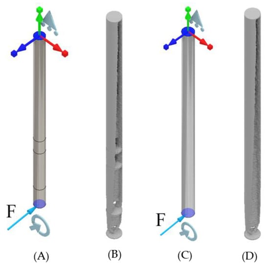 Other direct skeletal prosthetics are available for use such as Osseointegrated Prostheses for the Rehabilitation of Amputees, OPRA. This system involves screwing into the bone cavity which increases the residual σ all along the anchor. This system works because it increases the user’s hip flexibility and extension in comparison to traditional socket interfaces. However, over time it was recorded that pain was detected due to the build-up of residual σ [14]. The ITAP is not only suited to use in humans but it has had clinical trial in canines. Noel Fitzpatrick et al. studied the procedure for installation and use in four separate canines. The study identified that all subjects’ quality of life improved due to the prosthetic attachment. However, canines 1–3 were euthanized due to metastatic disease spreading throughout the body; it was unclear if this was related to the ITAP [15]. As the ITAP can be fitted for different purposes and species, bespoke parts can be produced. This is extremely useful as the properties of bone vary as well as the length of the remaining bone after amputation, see Figure 1 and Figure 2. Bone shape and modelling can be recorded by using Computed Tomography (CT) scanning. This creates a need for design iterations to model and build an ITAP that suits the individual’s lifestyle. In this process it is essential to design a build that does not over engineer the forces acting upon the leg. Failure to work in this design constraint could cause near fatal damage to the user resulting in further amputation or loss of life. This is due to the failure of the anchor supporting the ITAP and the potential rupturing of arteries and veins surrounding the localized area of the prosthetic. The work of Sullivan et al. concluded that the use of direct skeleton attachments for prosthetics increases the user’s quality of life and the function of the prosthetic limb. Comfort also increased due to the lack of sores developing on the stump. This is because there is no contact between the stump of the limb and the prosthetic sock fitted over the top. However, the reports concluded that aspects of the development of the ITAP needed further advancement because the “trans-femoral amputee” case needs extensive review before it becomes a common clinical procedure for prosthetic rehabilitation [16]. It has been identified by Bird et al., that the initial area of failure and high σ concentration of the ITAP is located at the root of the ITAP [13]. The results of the study identified that a single safety notch was not enough for the ITAP to be suitable for use. This is because the strength of the Ti used for the ITAP is greater than the bone, so the bone would fail before the ITAP, resulting in damage to the user. Thus, it is identified that a comparable σ between bone and the ITAP at the point of insertion is needed for successful development of the product. This is categorized as designing in failure for success.