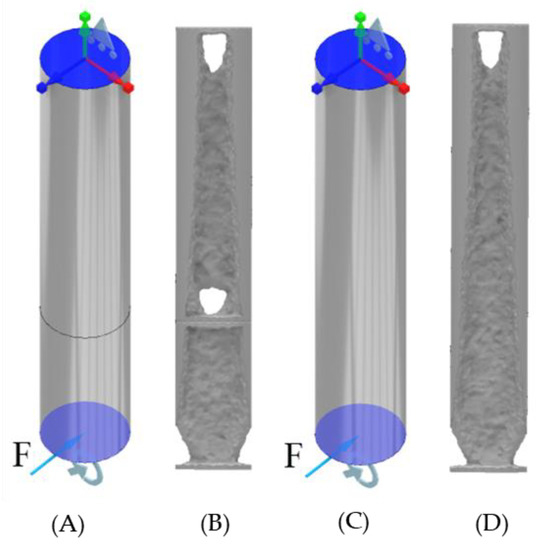 The MATLAB 3D simulations provide the most detailed results. From the study, the areas where material can be removed to save weight due to the minimal σ present is consistently located at two positions. These being at the centroid of the fixed support at the boundary wall where the ITAP’s Sections B and C meet. The next area where material can be removed is located within Section D, 57 mm < x < 85 mm see Figure 10A, where material is being removed on the opposite side of the applied Lateral and Frontal loads. These two positions of material reduction are concordant with both the ANSYS and 2D MATLAB simulations as well as all three models of the 3D MATLAB simulations. The size of the voids forming is dependent on the volume percentage of material being simulated. The results from the Standard models identify how the ITAP could be shaped to meet the individual’s body characteristics using the loads calculated. The results identify the areas of material that are less important to the structural integrity of the external sections of the ITAP. The Vertical and Horizontal simulations look at the cross-section of the ITAP with the Axial and either Lateral or Frontal forces applied, Furthermore, the remaining internal structure mimics the internal structure found in bone, Figure 10, forming pathways in-between voids in the ITAP, similar to the findings of both Otomori and Wu with their respective studies and coding [22,24]. Both the Vertical and Horizontal results show this pattern. The voids are geometrically triangular in design as they are extremely capable of distributing σ within their shape [24]. There is minimal variation between the two sets of results, and this is expected as the forces being applied are similar in size. As the percentage of the material used increases, the definition of the voids and interconnecting pathways decreases. For these study 30 simulations were conducted utilising 10 different volume fraction limits for three different tested geometries.