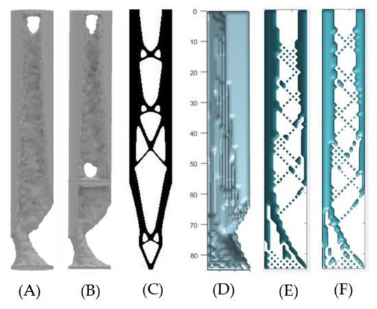 Visual comparison between topology simulation of Section C and D of the ITAP at 50% volume of material, (A) one solid model using ANSYS’s control, (B) 2 sections joined together using ANSYS’s simulation controls, (C) 2D MATLAB simulations with only the shear force being applied to identify the potential areas of material reduction, (D) 3D MATLAB standard model, (E) 3D MATLAB vertical model, (F) 3D MATLAB horizontal model.