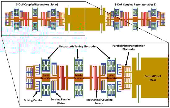 The structural design of mode-localized MEMS accelerometer with two sets of 3-DoF weakly coupled resonators on either side of central proof mass.