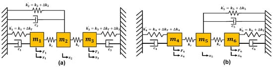 Lumped mass-spring-damper model of the 3-DoF weakly coupled MEMS resonators (a) Set A (b) Set B.