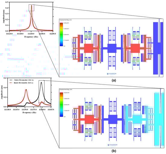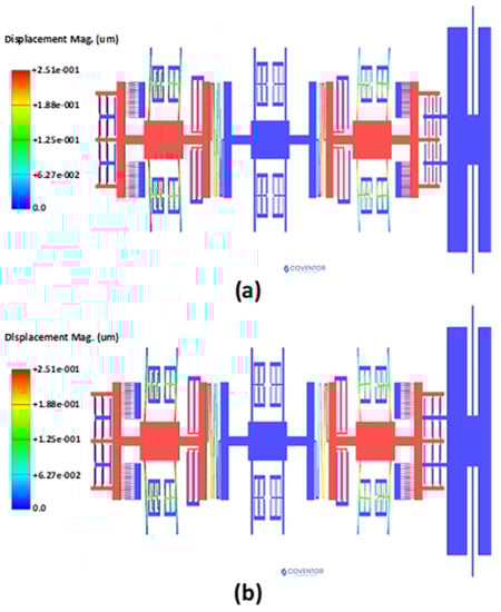 The natural frequency analysis and corresponding mode shapes of the MEMS accelerometer are analyzed by behavioral model based FEM simulations in the CoventorWare software. Figure 3a shows the in-phase and out-of-phase mode shapes of the 3-DoF MEMS resonators, in Set A of the MEMS accelerometer, with the natural frequency values of 12,220.048 Hz and 12,223.264 Hz respectively. In the in-phase mode, both the inner and outer resonator vibrate in the same direction while in the out-of-phase mode both resonators vibrate in the opposite direction.