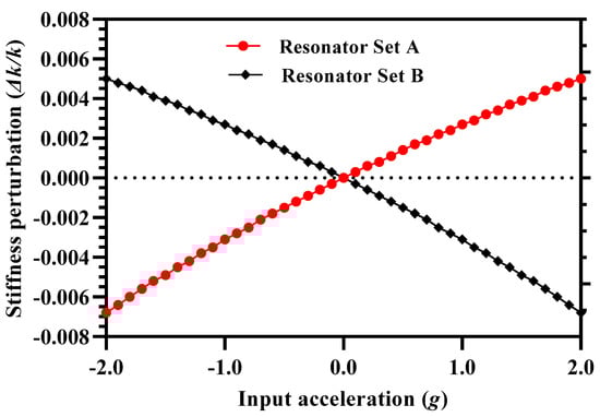 The proof mass of the MEMS accelerometer is electrostatically coupled to the inner resonators in the resonator Set A and Set B. The change in the stiffness of these inner resonators corresponding to the input acceleration g can be expressed as;