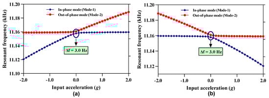 The bandwidth of resonant modes in the coupled 3-DoF resonator systems is strongly dependent on the quality factor and at low air pressure both the in-phase and out-of-phase modes may overlap and hence result in mode aliasing. For the 3-DoF weakly coupled resonator system, the frequency difference between the in-phase and out-of-phase mode must be greater than to avoid mode-aliasing [22]. Figure 6a,b shows the frequency variation in both the in-phase and out-of-phase mode frequency for the resonator Set A and Set B respectively for an input acceleration in the range of ± 2 g. The results show that in the resonator Set A, both the in-phase and out-of-phase resonant frequency values are separated by a minimum frequency of 3.0 Hz at 0 g input acceleration i.e., at = 0. The frequency difference between the two resonant modes increases as the input acceleration changes from 0 to ±2 g. The behavior of frequency difference variation with respect to input acceleration is similar in 3-DoF resonator Set B. For the MEMS accelerometer, the value at 0 g is 2.92 Hz which is less than the = 3.0 Hz. Thus, the anti-aliasing condition is fully satisfied at zero stiffness perturbation.