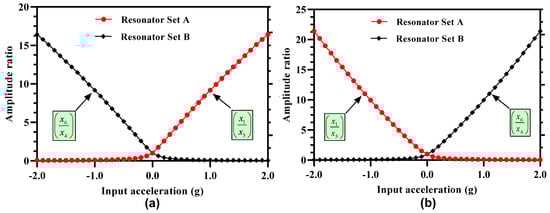 To sense the input acceleration, the amplitude ratios of (for the resonator Set A) and (for the resonator Set B) are utilized and the output metric is the difference of these two ratios i.e.,