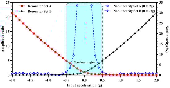 The lower absolute value of input acceleration for the proposed MEMS accelerometer design is limited by the nonlinearity and mode-aliasing effect. As discussed in Section 4.5, for input acceleration ±0.5 g, the amplitude ratio of outer and inner resonators in both resonator Set A and Set B is highly nonlinear. Thus, limiting the dynamic input acceleration range to ±0.5 g to ±2 g if amplitude ratio is considered as an output metric for acceleration measurement. However, when amplitude ratio difference is considered as an output metric, the overall response becomes linear for the whole input acceleration range of ±2 g. Thus, the proposed MEMS accelerometer design allows to overcome the inherent nonlinearity effect on the dynamic input acceleration range by considering the amplitude ratio difference of two resonator sets as an output metric instead of amplitude ratio of outer and middle resonators in individual resonator sets.