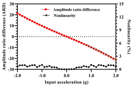 Amplitude ratio difference of resonators in Set A and Set B of MEMS accelerometer and nonlinearity for input acceleration in the range of ±2 g.