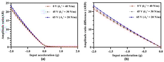 From Equation (18), it is clear that the vibration amplitude of the outer and inner resonators in the 3-DoF weakly coupled resonator sets for a stiffness perturbation is also dependent on the mechanical stiffness of the middle resonators in Set A and Set B of the MEMS accelerometer. Thus, effect of electrostatic stiffness tuning of the middle resonator on the amplitude ratio sensitivity (AR/g) and amplitude ratio difference sensitivity (ARD/g) of the outer and inner resonators in both sets is analyzed for tuning voltage of 45 V and 65 V applied to the outer and inner resonators. Figure 14 show that for electrostatically tuned effective stiffness = 30 N/m and = 20 N/m of outer and inner resonators, the amplitude ratio and amplitude ratio difference sensitivity decreases by increasing the electrostatic tuning voltage to the middle resonator. For the case of = 30 N/m, the AR/g and ARD/g values are 9.255 and 10.150 respectively for a tuning voltage values of 50 V. Similarly, for the case of = 20 N/m, the AR/g and ARD/g values are 9.713 and 10.611 respectively for a tuning voltage value of 65 V.