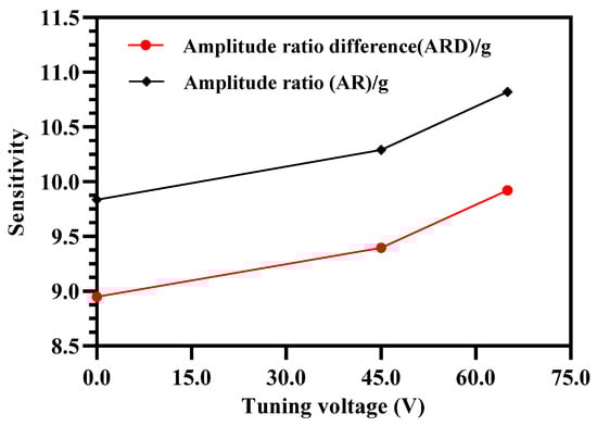 Figure 11 summarizes the effect of increasing tuning voltage on the amplitude ratio and amplitude ratio difference sensitivity of the MEMS accelerometers. The amplitude ratio and amplitude ratio difference sensitivity increases to 9.92 and 10.82 respectively at tuning voltage of 65 V in comparison to the amplitude ratio and amplitude ratio difference sensitivity values of 8.94 and 9.84 respectively at 0 V.