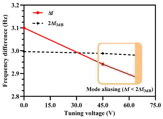 The frequency separation between the in-phase and out-of-phase resonant modes of the 3-DoF weakly coupled resonator sets in the MEMS accelerometer and hence the mode aliasing effect is dependent on the mechanical stiffness of the resonators and coupling springs with a relation represented by the parameter (Equation (23)) in Equations (21) and (22). The electrostatic mechanical stiffness tuning of the outer and inner resonators in the Set A and Set B of the MEMS accelerometer results in an increase in the amplitude ratio of the resonators at tuning voltage of 45 V and 65 V, but decreases the spacing between the two resonant modes which leads to mode aliasing. In this section, the effect of electrostatic stiffness tuning of the middle resonators, in both the resonators Set A and Set B, is analyzed through FEM simulations. Figure 13a shows that for the case when tuning voltage of 45 V is applied to the outer and inner resonators with = 30 N/m, the increase in the electrostatic tuning voltage on the middle resonators results in an increase in the ∆f between the in-phase and out-of-phase resonant modes. At tuning voltage of 50 V, applied to the electrostatic tuning electrodes attached to the middle resonators, the ∆f = 3 Hz which is above the value of 2.980 Hz. Similarly, Figure 13b shows that at the tuning voltage of 65 V to the middle resonators, the ∆f value between the two modes is 2.961 Hz which is above the value 2.948 Hz for the case when = 20 N/m. These results show that by the electrostatic stiffness tuning of the middle resonators, the anti-aliasing condition for = 30 N/m and = 20 N/m can be satisfied.