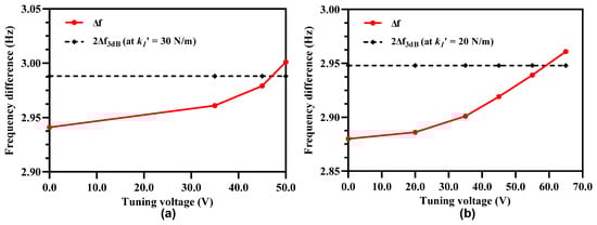 Effect of applying electrostatic tuning voltage to the middle resonators in 3-Dof resonator Set A and Set B on the frequency separation between two modes for (a) = 30 N/m and (b) = 20 N/m.