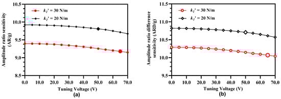 Effect of electrostatic stiffness tuning of the outer and inner resonators in both resonators sets on (a) amplitude ratio sensitivity (b) amplitude ratio difference sensitivity.