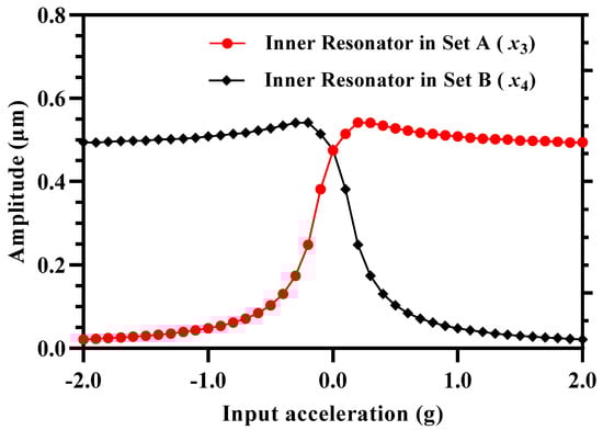The upper value of the dynamic input acceleration is limited by the minimum amplitude the resonator that can be measured. For the 3-DoF weakly coupled resonators, the increase in the input acceleration and hence perturbation in the inner resonators, that are electrostatically coupled to the proof mass in both Set A and Set B, leads to a decrease in the vibration amplitude as shown in Figure 15. For an input acceleration in the range of 0 to −2 g, the perturbation in the inner resonator in Set A results in a decrease in the vibration amplitude . Similarly, an input acceleration in the range of 0 to +2 g and corresponding stiffness perturbation in the inner resonator in Set B results in a decrease in the vibration amplitude .
