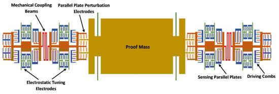 where N is the number of parallel plate capacitive perturbation electrodes, is the permittivity, A is the overlap area of electrodes, d is the initial gap between the electrodes, is the mass of the proof mass, is the stiffness of the suspension beams attached to the proof mass, and are the mass values for inner resonators in the resonator Set A and B respectively, and is the stiffness of the inner resonators in the resonator Set A and B respectively, is the input acceleration and is the potential difference between the resonators and proof mass. The term is due to the DC voltage based displacement applied to the resonators and is given as: