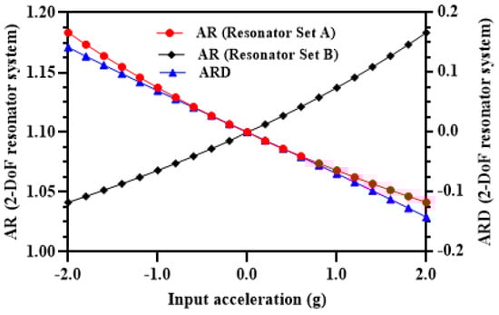 In addition to the limitation of nonlinear response in the small input acceleration range, the amplitude ratio of the resonators in both Set A and Set B is also strongly dependent on the input acceleration being in the positive or negative range. From Figure 4 and Figure 7, it is clear that for the 3-DoF resonator Set A and for input acceleration in the range of 0 to −2 g (< 0) the out-of-phase mode amplitude ratio should be selected for high sensitivity and for input acceleration in the range of 0 to 2 g (> 0) the amplitude ratio of the in-phase mode should be selected. Similarly, for the resonators Set B, the operational mode for amplitude ratio must be switched between the in-phase and out-of-phase mode for high sensitivity depending on the normalized stiffness perturbation being negative or positive. The selection of difference of amplitude ratios of the 3-DoF weakly coupled resonators sets allows to mitigate the limitations of using the amplitude ratios of individual resonator Set A and Set B as an output metric.