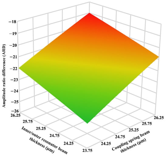 The response surface plot for the effect of the 5% variation in the beams thickness of inner/outer resonators and coupling springs on ARD of the MEMS accelerometer.