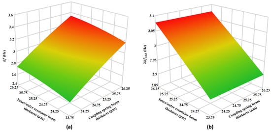 The response surface plots for the effect of the 5% variation in the beams thickness of inner/outer resonators and coupling springs on (a) and (b) .