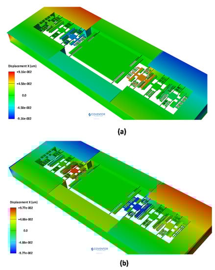 The operating temperature of the MEMS accelerometer is generally in the range of 40 °C to 85 °C [31]. The temperature dependent properties of the material and thermal stresses affect the performance parameters of MEMS accelerometer. The temperature dependent variation in the material properties specially the Young’s modulus is very less with a 0.016% shift in value with respect to room temperature in the temperature range of 40 °C to 85 °C [32,33]. Thus, the effect of temperature dependent variation in Young’s modulus is ignored in the subsequent discussion. To analyze the effect of operating temperature variation, in the range of −40 °C to 85 °C, on the performance of 3-DoF weekly coupled MEMS accelerometer, an FEM based thermomechanical analysis is carried out. Both the silicon substrate and structural layer of 400 µm and 25 µm thickness are considered in the analysis. The thermal deformation analysis results show that temperature induced deformation in MEMS accelerometer structure is mostly in-plane. Figure 20a and (b) shows the thermal deformation profile of the MEMS accelerometer at 40 °C and 85 °C respectively. The results show that at −40 °C, the inner resonators in both set A and set B have equal thermal deformation in opposite directions with a value of 59 nm. Similarly, the thermal deformation in the outer resonators in both set A and set B is equal and in opposite direction with a value of 17.42 nm. Figure 20b shows that at 85 °C, the inner resonator sets move towards the proof mass with a value of 83 nm, thus decreasing the initial gap between the perturbation electrodes.
