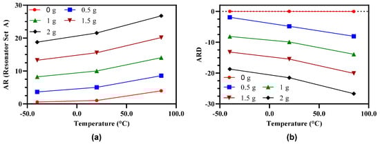 Effect of operating temperature variations on the (a) Amplitude ratio and (b) amplitude ratio difference of the MEMS accelerometer.