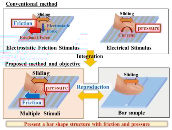 In a previous study, we developed an integrated tactile display using electrical and electrostatic friction stimuli, considering their affinity to information devices and multiple tactile stimuli [28], as shown in the bottom-left panel of Figure 1. According to related studies, electrical and electrostatic friction stimuli can provide the sense of pressure and friction, respectively, as shown at the top of Figure 1. Our tactile display can provide both an electrical stimulus and an electrostatic friction stimulus while controlling the roughness reproduced by the electrical stimulus and the electrostatic friction stimulus independently. Ito et al. proposed a similar integrated tactile display using vibrations generated by a mechanical actuator and the friction generated by an electrostatic force [27]. However, their tactile display was bulky, and its stimulus resolution was poor. On the other hand, owing to the principles of electrical and electrostatic stimuli, our tactile display requires only electrodes for both stimuli. Thus, via the microfabrication technique, these stimulators can be miniaturized and can attain a higher resolution. Although we outlined the fundamental characteristics of this tactile display in our previous study, the tactile sense it provides has yet to be investigated. One of the authors of the present work earlier revealed that a single electrical stimulus could reproduce bar shapes [29]. Our proposed tactile display not only provides this electrical stimulus to reproduce bar shapes but can also enhance bar shapes with the presentation of friction, as shown in the bottom-right panel of Figure 1. In contrast, in other studies in which surfaces were reproduced with an electrostatic friction stimulus, only fine surfaces were sufficiently reproduced [30,31]. Additionally, it was found that the electrostatic friction stimulus was unsuitable for the presentation of three-dimensional shapes.