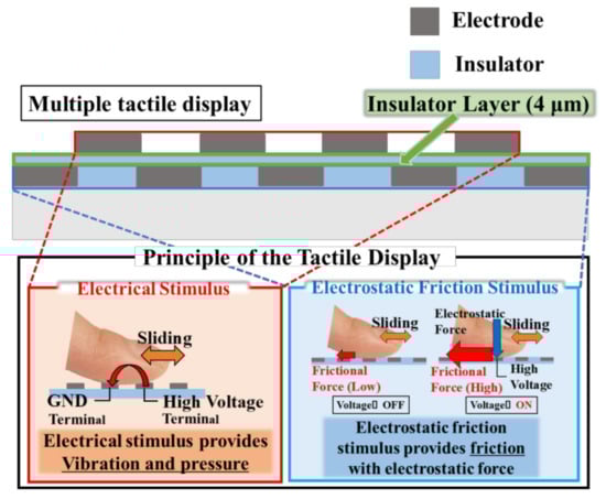 Figure 2 depicts the structure and principle of the proposed tactile display. The electrodes used to stimulate electrical and electrostatic friction are alternately arranged, and both can simultaneously contact the skin when users slide their fingerpad on the tactile display, as shown at the bottom of Figure 2. In the following section, we explain the principles of the electrical and electrostatic friction stimuli.