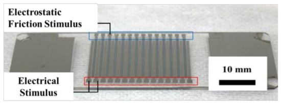 The electrostatic force increases the resulting frictional force when a user slides his/her fingerpad on the insulator layer. In this study, the width and length of the electrodes used for the electrostatic friction stimulus were 0.9 and 15 mm, respectively, as shown in Figure 3. The thickness of the electrodes was 100 nm. To arrange the electrodes for the electrical stimulus between the electrodes for the electrostatic friction stimulus, the separation between electrodes for the electrostatic friction stimulus is designed to be 1.1 mm. The electrodes were made of chromium, whereas the insulator layer was made of SiO2. The insulator layer was 4-μm thick.