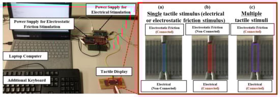 Figure 6 illustrates the experimental setup, which consisted of a laptop computer (Surface Laptop, Microsoft Corp., Redmond, WA, USA), microcontrollers (mbed LPC 1768, ARM Ltd., Cambridge, UK), a high-current supply for the electrical stimulus (MHV 12-300S10P, Bellnix Co., Ltd., Saitama, Japan), a high-voltage power supply for the electrostatic friction stimulus (MHV 12-1.0k2000P, Bellnix Co., Ltd., Saitama, Japan), an additional keyboard (KB212-B, Dell Inc., Round Rock, TX, USA), and the fabricated tactile display. The values of the voltage and current were controlled by pressing the assigned buttons on the keyboard. According to the input, signals were sent to the current and voltage power supplies via the microcontroller. The connections for each stimulus condition are shown in the right panel of Figure 6. The voltage waveform for the electrostatic friction stimulus was square and the duty cycle of the voltage was 20% because the power supply can only generate positive voltage. The current waveform was a pulse, and the pulse width of the current was fixed at 200 µs [33,34]. As an electrical stimulus can occasionally cause pain depending on its waveform condition, we selected the pulse width used in related studies to provide painless stimulation. Before the experiments, we instructed the participants to slide their dominant fingerpad at a speed of 50 mm/s using a marker shown on a smartphone.