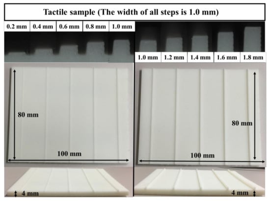 It is known that an electrical stimulus can reproduce bar shapes. We therefore considered whether multiple stimuli using electrical stimulation could reproduce even more realistic bar shapes. In this experiment, we evaluated how the multiple stimuli condition affected perceived senses. We asked the participants to slide their finger across the tactile display at a speed of 50 mm/s under multiple stimuli. The participants then compared the stimuli with 3D-printed bumps, as shown in Figure 7, and selected the bars that provided a stimulus that was the most similar to the multiple stimuli. The heights of the bars were 0.2 mm, 0.4 mm, 0.6 mm, 0.8 mm, 1.0 mm, 1.2 mm, 1.4 mm, 1.6 mm, and 1.8 mm. The width of all bumps was determined by the electrode and fixed at 1 mm. Additionally, the participants rated the similarity between the multiple stimuli and the bars (1 to 7). The frequencies of the electrical stimulus and the electrostatic stimulus were fixed at 320 Hz, according to the results of the previous experiments. In this evaluation, we widened the range of the peak value to evaluate various conditions, and the peak voltage and peak current were set to 0.0, 1.0, 1.3, 1.6, and 1.9 times higher than the threshold values. The threshold values were obtained from the previous experiments. A total of 24 trials were performed on each participant depending on the combination of voltage and current without the stimulus condition.
