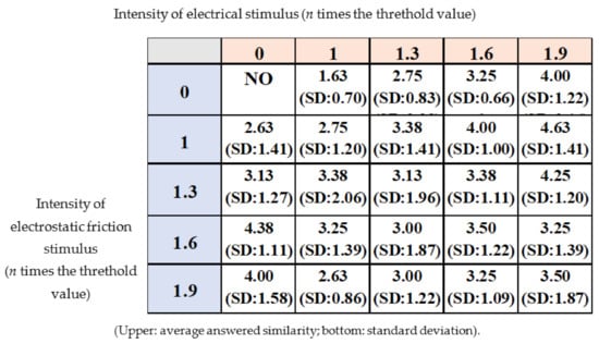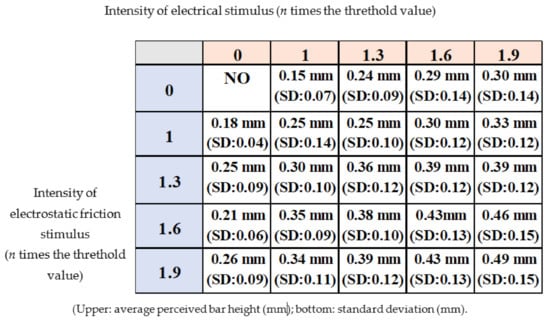 Figure 10 shows the relationship between the electrical and electrostatic friction stimuli conditions and the average of the height reported by the participants. The average of the answered similarity under each stimulus condition is shown in Figure 11. More detailed data are provided in Table A1 and Table A2 in Appendix B and Appendix C. The average height was 0.30 mm or less when only the electrical stimulus or the electrostatic friction stimulus was provided. In the case of the electrical stimulus, the average height was nearly the same as compared to the results of the related study [15]. The results for the electrostatic friction stimulus revealed that it had the potential to reproduce a bar shape with a height of 0.26 mm or less under this experimental condition. The answered similarity was a maximum of about 4 (60%) for only the electrical stimulus or only the electrostatic friction stimulus.