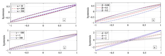 - From Figure 2a, it is observed that the increase in the value of causes an increase in the output hysteresis and the overall hysteresis curve moves upwards.
