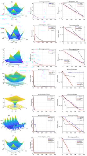 Performance analysis of genetic algorithm (GA), PSO and MPSO optimization on unimodal (F1–F3) and multimodal (F4–F7) benchmark functions.