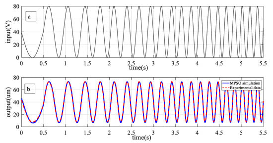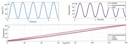 Figure 7a shows the input excitation to the piezoelectric actuator. With the identified parameters by MPSO described above, the predicted output of piezo-actuated motion-stage can be generated using (7) and (8). Figure 7b,c shows that the predicted output and hysteresis curve from the identified Duhem model are consistent with the experimentally obtained ones.