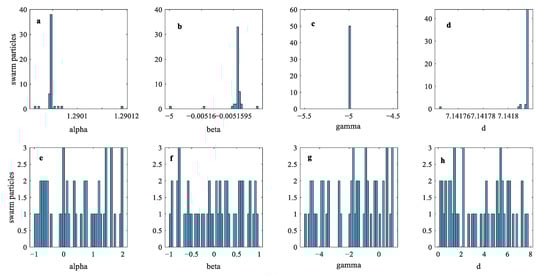 Convergence characteristics of MPSO and PSO are shown in Figure 9 and Figure 10, and it can be seen that MPSO is superior to traditional PSO in avoiding the local optima problem. In the current example of the Duhem model identification, MPSO encountered local minima at iteration 174 and the randomness operator from (19) comes into play and distributes swarm particles evenly in each search dimension. A comparison between swarm locations in the search space for parameters and d at the local minima condition and after application of MPSO’s randomness operator is shown in Figure 11a–d and Figure 11e–h, respectively.