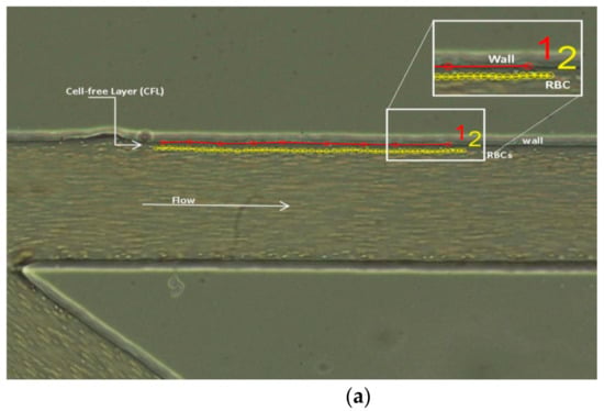 There are also different plugins to track RBCs, to count, or to measure the CFL thickness such as MtrackJ or ZProject. For example, in the study of the RBCs or other blood cell tracking, the plugin MtrackJ [49] is often used, facilitating the manual tracking of moving objects in image sequences and the measurement of basic track statistics. Through the MtrackJ plugin, the centroid of individual RBCs can be tracked, allowing obtaining the trajectory of each RBC. Additionally, it can be used to estimate RBC velocity, taking into consideration the x and y positions at each point (Figure 1a). To study the phenomena of CFL, manual tracking by MtrackJ can also be used or, as an alternative, the automatic function ZProject in ImageJ can be applied to process several images at once, creating a stack, and allowing observing the path of RBCs in the channel (Figure 1b). In Figure 1 is possible to see the application of the MtrackJ plugin to determine the CFL thickness in blood flow study [79].