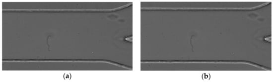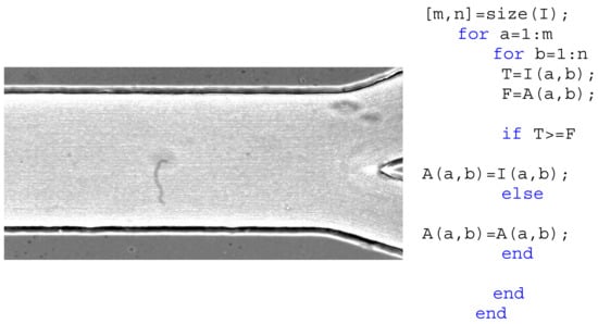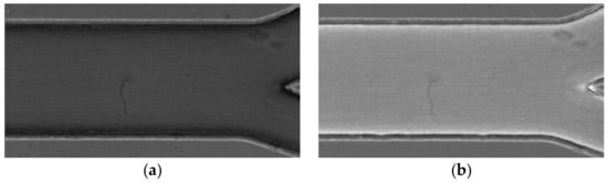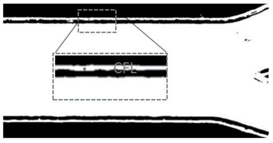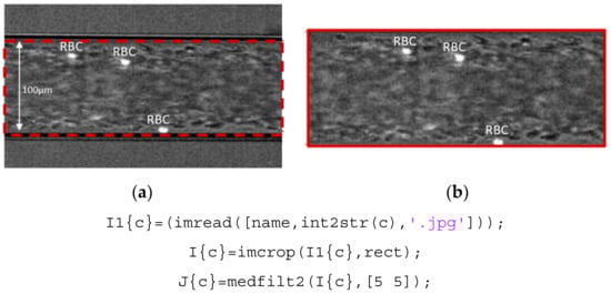 Firstly, the sequences of images were loaded to the GUI. Then, the region of interest (defined by the user) was cropped from the original images with the function imcrop; also a standard region is defined, but the user can change it for a better purpose. With this operation, we can work only with the region which needs to be analyzed (the region between the microchannel walls), making it easier to handle the images for the next steps, as presented in Figure 3.