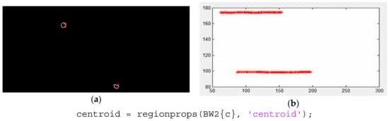 After the segmentation processing, the RBCs were tracked and sets of data (and positions) were obtained with the MATLAB function from the image processing toolbox, regionprops [27] (cf. Figure 6). This function measures a set of properties (area, centroid, etc.) for each connected component (RBC) in the binary image.