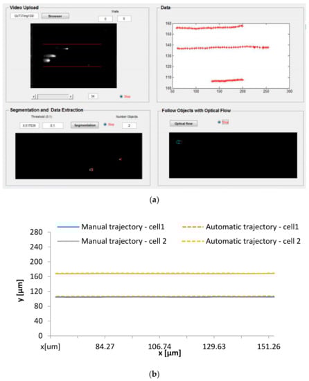 Automatic method results: (a) developed graphical user interface (GUI) in MATLAB and (b) trajectories of individual labeled RBCs determined by the manual and automatic method.
