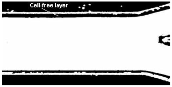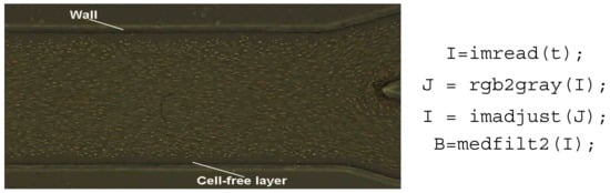 In microcirculation, the study of red blood cells (RBCs) flowing in microvessels and microchannels and the study of the cell-free layer (CFL) thickness in different microchannels geometries are very important to get a better understanding of the blood rheological properties and disorders in microvessels in a fast and accurate way. The presence and physiological characteristics of other cell types are also of great clinical relevance [19]. In this kind of study, the image analysis has an important role to obtain crucial information about blood rheology. For blood flow in microvessels, where there is a large number of interacting cells, manual tracking methods have been used to accurately track individual deformable cells flowing through glass capillaries [1,11,20], straight polydimethylsiloxane microchannels [21], stenotic arteries [22,23], hyperbolic contractions [24], and bifurcations [25]. However, the manual data collection is extremely time-consuming to have a statistically representative number of samples and may introduce operators’ errors that eventually limit the application of these methods many times at different conditions [26]. Hence, it is crucial to develop versatile and automatic methods able to automatically track and compute multiple cell trajectories and able to measure the cell-free layer thickness in a network of microchannels.