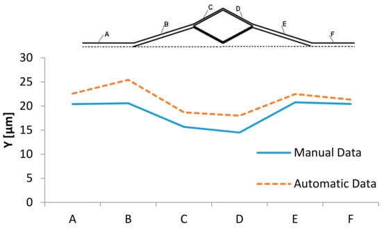It is possible to note that the data obtained by the automatic method have similar behavior with the manual data. However, the values have some discrepancies. The quality of the image and also the level of the threshold can influence this type of measurements.
