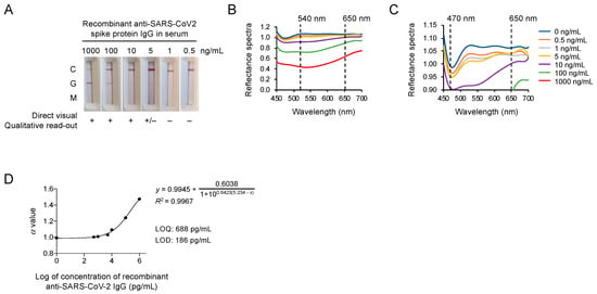 In this quantitative platform system, the color intensity of an LFA test is analyzed using the spectrometer, where the presence of the COVID-19 IgG or IgM is based on a cut-off value for the spectral intensity. Thus, the LOD needs to be determined for evaluating the performance of this platform system. To this end, COVID-19 IgM/IgG test strips loaded with various predetermined, spiked amounts of IgG in serum (0, 0.5, 1, 5, 10, 100, 1000 ng/mL) were used to obtain the continuous reflectance spectra (from wavelengths 450 to 700 nm), where the data from three replicates were combined for the analysis. for analysis. As shown in Figure 1A, the presence of a band at the control (C) line on all test strips validated the tests of various IgG concentrations. Because we loaded IgG, and not IgM, there was no band at the IgM (M) line on each test strip. The band intensities at the IgG (G) line decreased as the concentration of spiked IgG decreased, and the bands became nearly invisible on the test strips that had been loaded with the IgG at concentrations lower than 5 ng/mL. The percentage of reflectance spectra reversely correlated with the amount of antibody complexes and, therefore, were decreased as the IgG concentration increased (Figure 1B). Notably, we found that the reflectance spectra of IgG at high concentrations (10, 100, 1000 ng/mL) were well separated at 540 nm and the reflectance spectra derived from low IgG concentrations (<5 ng/mL) were still clearly differentiated at 470 nm after amplifying the reflectance spectra scale (Figure 1C). The reflectance spectra were used to acquire an α value for constructing an IgG concentration standard curve of reflectance. As shown in Figure 1D, the four-parameter logistic regression fit the reflectance spectra data the best, providing an R2 value of 0.9967. Based on this regression model, the LOD and limit of quantification (LOQ), which were three and ten standard deviations from the average blank value, were determined as 186 pg/mL and 688 pg/mL, respectively. Therefore, this platform indeed provided excellent sensitivity for detecting a trace amount of SARS-CoV-2 antibodies.
