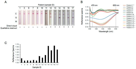 The excellent limit of detection prevented false-negative COVID-19 test results. (A) The results of the COVID-19 IgM/IgG test strips were used to test a panel of 13 suspected patients. Only patient ID#s 12, 13, 14, 15, 16, and 17 were clearly considered positive using a direct visual qualitative read-out. (B) The percentage of reflectance spectra derived from the patients’ test strips. Stars mark those patients who tested positive according to the spectrochip analysis. (C) The α value of patients’ reflectance spectra at 470 nm vs. 650 nm.