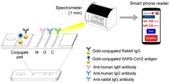 A lateral flow immunoassay (LFA) is a paper-based in situ detection platform that is characteristically inexpensive, easy to use, and can be operated by a non-health-care provider [,]. While LFA is an ideal point-of-care test, conventional colorimetric LFAs have unsatisfactory limits of detection (LODs) because the subtle color variations are difficult to differentiate visually. Nonetheless, the chromophores on the paper test strips emit complex spectra at various wavelengths that can be readily detected by a spectrometer to provide precise and quantifiable information. Thus, we proposed the coupling of an LFA with a portable spectrochip device to improve sensitivity and enable quantitative analysis. Additionally, we employed a gold colloid, which is a suspension of gold nanoparticles, to enhance the visibility and stability of the LFA. We believe that the extraordinary detection limit that is achievable with this new platform (i.e., the integration of the immunoassay and the optical reader) may make it an invaluable tool for accurate serological COVID-19 antibody testing.
