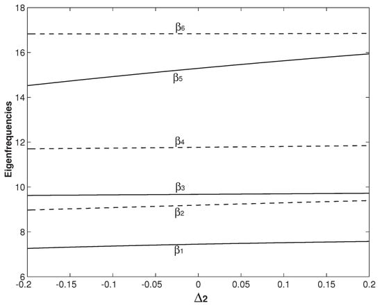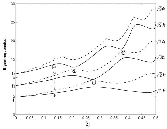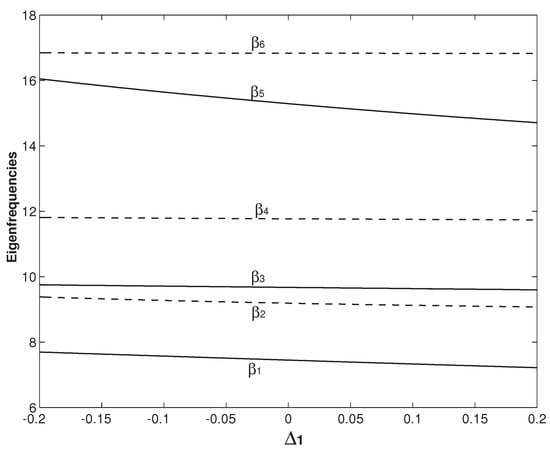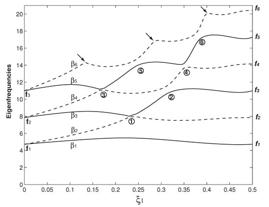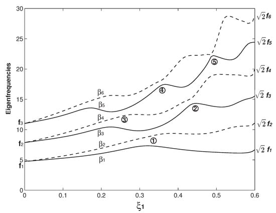 Figure 10 and Figure 11 study the influences of and , respectively. In Figure 10 and Figure 11, and are set. In Figure 10, is fixed and varies from to . Physically, defined in Equation (7) is the difference of the mass per unit length between the two beams. Larger means more mass of the system. Therefore, all s in Figure 10 decrease monotonically with the increase of . In Figure 11, is fixed and varies from to . is also defined in Equation (7) and physically it is the difference of the bending stiffness between the two beams. Larger means larger system stiffness. Therefore, all s in Figure 11 increase monotonically with the increase of . From the results in Figure 10 and Figure 11, it is concluded that and can have significant impact on some eigenfrequencies of s. The dramatic decrease and increase of in Figure 10 and Figure 11 are seen. However, there is no veering behavior of abrupt converging and then diverging. The variations of and only change the gap distance of two (adjacent) veering eigenfrequencies, i.e., , and thus their veering neck. For example, the gap distance between and in Figure 10 decreases with the increase. In contrast, the gap distance between and increases with the increase in Figure 11. The setting of in Figure 10 and Figure 11 is close to the veering locus of marked as No. 1 in Figure 8, which is the veering. It is also noticed that, as or varies, the gap distance between and is always kept the smallest among all the gap distances.