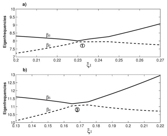 The veering characteristics can be summarized from the results in Figure 2: higher eigenvalues experience more veering loci. For example, there is no veering locus for ; only one for marked as No. 1; two for marked as Nos. 1 and 2; three for marked as Nos. 2–4; and four for marked as Nos. 3–6. Because only up to six eigenfrequencies are plotted, there are only two veering loci marked as 5 and 6 shown in Figure 2. Actually there are three more veering loci as indicated by the arrows, which are formed by the veering. Physically, the variation of the overhang length () changes the mass and stiffness distribution of the system and its impact on different mode is different [], which is clearly seen in the wavy variations in Figure 2. As the two overhangs here are identical, there is only one control parameter, i.e., . The eigenfrequency variation as the function of is a curve and the corresponding veering is thus called curve veering [,]. When the number of the control parameter is two and the eigenvalue variation is a surface, the corresponding veering is thus called surface veering []. Six eigenfrequency veering loci are identified and marked with Arabic numbers in Figure 2. Locus No. 1 is the veering; No. 2 is the veering; Nos. 3 and 4 are the veering; and Nos. 4 and 5 are the veering. The smallest gap between two adjacent veering eigenvalues is called veering neck [] or veering width []. Clearly, the veering necks of veering loci Nos. 1 and 3 are much smaller than the other three. Figure 3 presents a closer look at these two veering loci. Figure 3a plots the veering around , at which the veering width is achieved. Similarly, Figure 3b plots the veering around , at which the veering width is achieved. Figure 3 shows a distinctive feature of veering: The two adjacent eigenvalues rapidly converge and then abruptly diverge; however, they do not cross each other. Therefore, instead of veering, a more straightforward name of “avoided crossing” is used by physicists []. It is worth mentioning that eigenvalue crossing rather than veering can occur for an overhanging structure [].