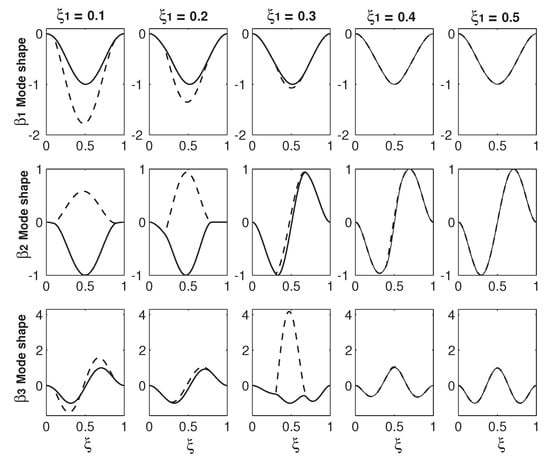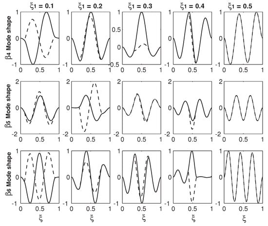 Instead of just focusing the mode shape variations in a narrow area before and after a veering locus, Figure 6 and Figure 7 provide an overall and more comprehensive study on the mode shape variations. In Figure 6 and Figure 7, each row is the mode shapes of a with different s of , , , and . The values of s are given in Table 1. For each row of a mode shape, the mode shapes with different s are plotted in the same scale for the comparison reason. Figure 6 presents the mode shapes of the first three s and Figure 7 presents those of the last three. Two patterns can be summarized from the results in these two figures. The first is that the odd mode of except experiences the in-phase/out-of-phase mode transition around the first veering locus and the out-of-phase/in-phase transition around the second veering locus, and then the mode transitions of the in-phase/out-of-phase and out-of-phase/in-phase alternate. In contrast, the even mode of reverses the transition patterns: mode experiences the out-of-phase/in-phase mode transition around the first veering locus and the in-phase/out-of-phase transition around the second veering locus, and then the mode transitions of the out-of-phase/in-phase and in-phase/out-of-phase alternate. As discussed above, Figure 4a,b shows the out-of-phase/in-phase mode transition around its first and only veering locus marked as No. 1, which is around . This out-of-phase/in-phase mode transition around is also captured in the mode at and that at as presented in the second row of Figure 6. However, as discussed in Figure 2, a higher eigenvalue/mode experiences more than one veering locus. For example, experiences two veering loci around marked as No. 1 and around marked as No. 2, as shown in Figure 2. Again, the mode in-phase/out-of-phase transition around the first veering locus of is captured both by Figure 4c,d and the modes at and , as presented in Figure 6. Around the second veering locus of , the mode out-of-phase/in-phase transition is captured in the modes at and in Figure 6.
